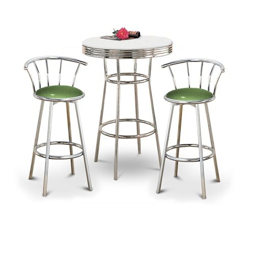 This table stands 41 3/4" tall and is 30" in diameter. Notice the "foot bar" for resting your feet. It is metal chrome with a chrome trim. The top is a nice hardwood which will last a long time. We also have this table in white. The two chrome finish stools come with footrests, swivel seats, and backrests and are well made and very comfortable! The seats are made of custom green celery vinyl and are a brand new style! The frame is made of metal making it a strong, heavy duty stool. The cushion is 14 inches wide consisting of 100% polyurethane foam making it very comfortable to sit on. Its gas pneumatic cylinder allows you to adjust the seat height anywhere between 24 in. to 29 in., making this bar stool adaptable and convenient for many different uses. But that is just the beginning! The entire seat swivels with no restriction, allowing you to turn full circle or more if you need to! There are 5 legs each with adjustable feet for stability on uneven surfaces and plastic protectors to prevent floor scratching. There is also a footrest that is firmly welded to the legs. The seat has a short backrest for your lower back, allowing you to relax and rock back and forth. Yes, you read correctly: rock back and forth! This bar stools has a tilt feature with adjustable tension and also has the option to limit the tilt! A one-of-a-kind bar stool that has many uses! Not recommended for over 250 lbs..../ Chrome Bar Table & 2 Chrome Adjustable 24"-29" Celery Green Vinyl Seat Barstools / Retro Chair